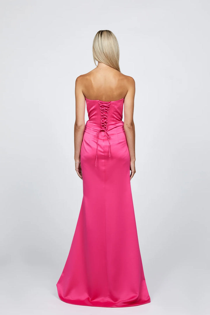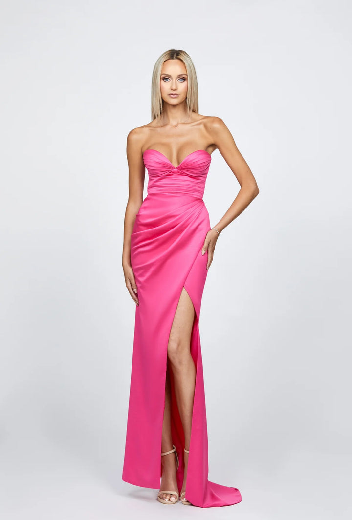 Captivating plunging strapless, sweetheart neckline. Gown has pleated bodice and built-in bust cups. Crossover skirt with side gathering, side split, tie-up back and invisible back zip. Fully lined and a slight back train for the perfect finishing touch.