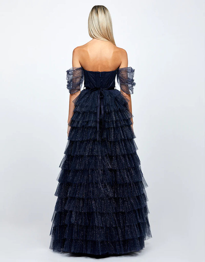 Dazzling sweetheart off-shoulder glitter gown, exuding timeless elegance and modern charm. Asymmetric crossover overlay at the bodice and corset waist create a flattering and structured silhouette. Built-in cups ensure a secure fit, while the detachable off-shoulder sleeves allow for versatile styling. The gown's multi-tiered full-length A-line skirt, crafted from luxurious tiered glitter tulle, adds volume and movement to your look, enhanced by a stiff mesh interlining for extra structure. The detachable pearl-appliqued belt cinches the waist for a refined finish. With an invisible back zip closure and full lining, this gown offers both comfort and a flawless fit.