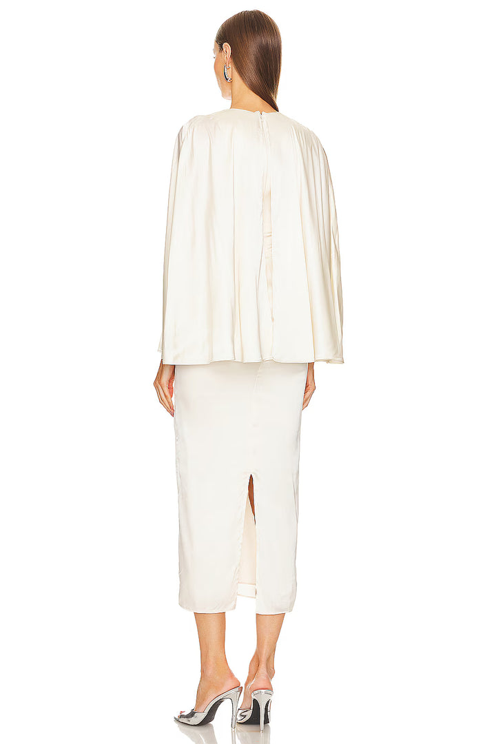 Beautiful cut-out dress, charmeuse fabric with a draped cape and back slit. With sultry cut-outs and a smooth feel, embrace the divine allure perfect for any formal affair. Partially lined and invisible back zipper closure.