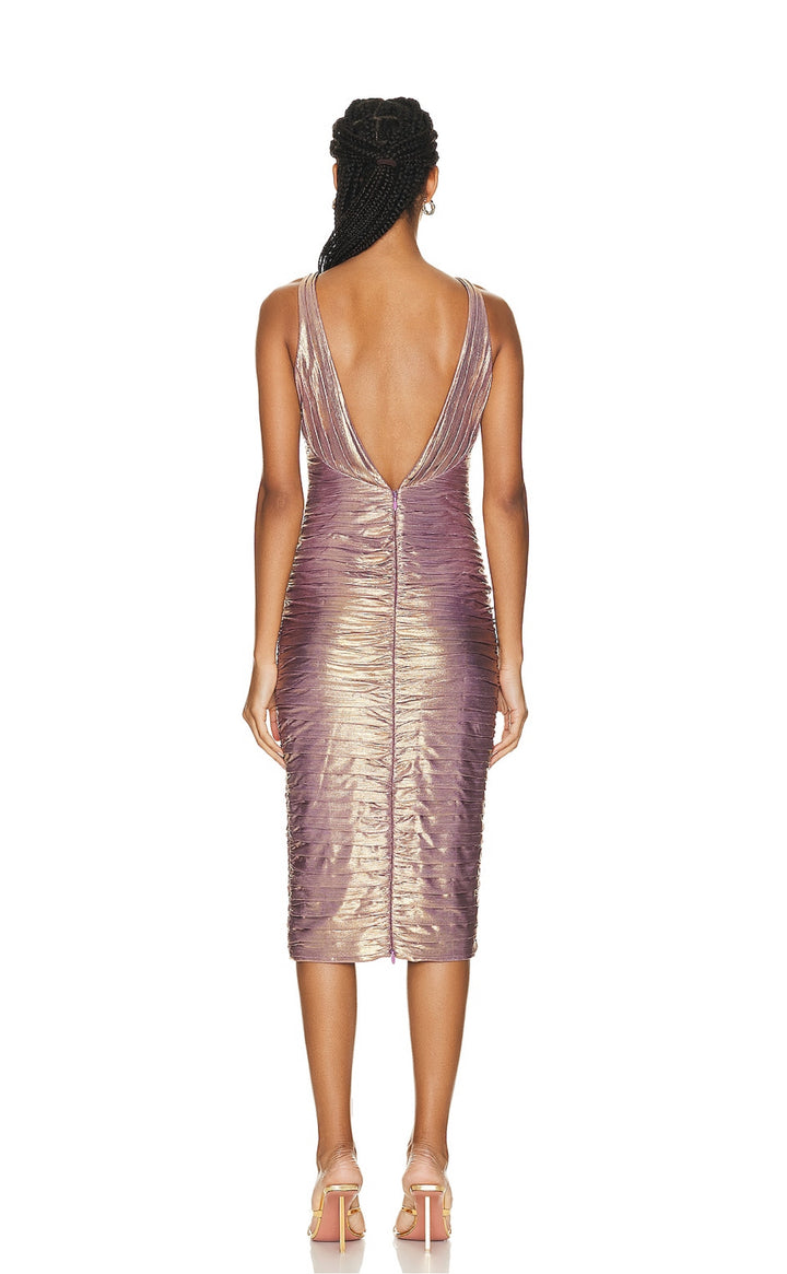 Stunning form fitting bodycon midi. Luxurious ruched lame’, plunging neckline and back. Dress is double lined with a hidden back zipper.