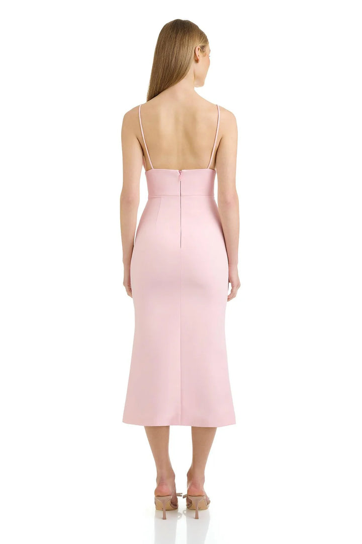 Elegant crepe dress, featuring a dainty neckline. The silhouette flows seamlessly into a mid-length, A-line skirt adorned with handcrafted scattered flower embellishments, adding a touch of timeless elegance. Fully lined and featuring an invisible zipper at the centre back, a perfect choice for next special occasion.