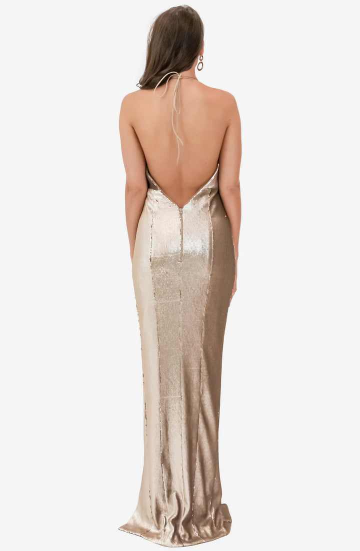 Stunning cowl neck sequin gown, the halter neckline is combined with a long, pencil skirt, plunging back and front split for flattering silhouette. Gown has in front side split, built-in bra cups, fully lined, tie neck, and back zip.