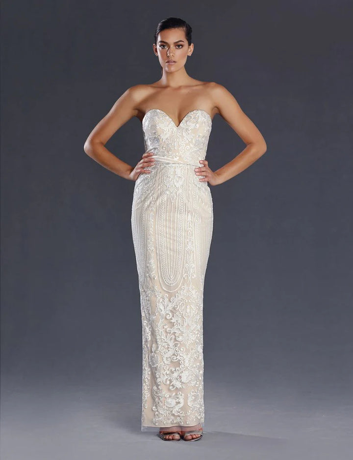 Elegant fitted strapless lace gown. Built-in bra cups, internal boning to perfectly shape the silhouette. Fully lined, split in back of skirt, invisible back zip. Total class.