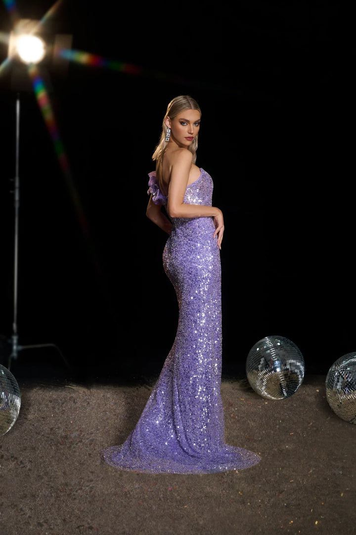 Glamourous beaded sequin gownStunning strapless design, sweetheart neckline, with one shoulder embellishmentGown falls beautifully into a full length skirt with front side split and slight trainInternal boning, bra cups, fully lined and invisible back zipPure glamour.