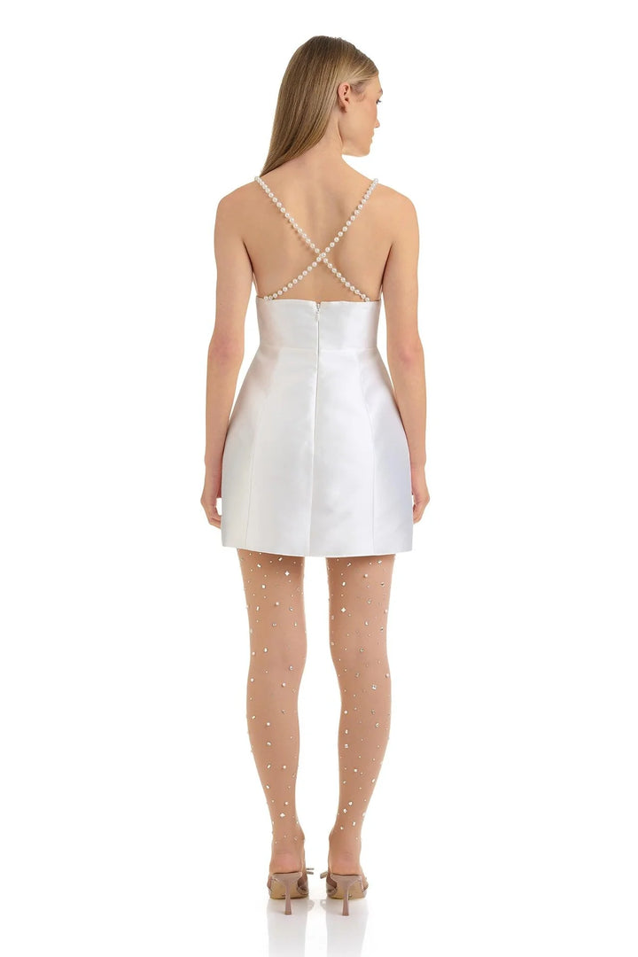 Exuding luxury, showcasing a triangular bustier bodice and a cinched waistband effortlessly cascading into a full mini skirt adorned with hand-crafted flowers. One of the bodice cups takes centre stage, embellished with a delicate fusion of beaded pearls and diamantés, complemented by pearl-beaded straps that elegantly cross over at the back. Fully lined with an invisible zipper at the centre back.