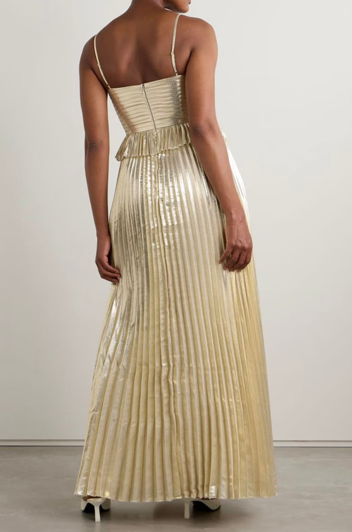 Beautiful gown made from metallic gold lamé, this ornate style is tailored with a pleated bodice, spaghetti straps, and a tiered feature. Full length pleated skirt that swishes with every step. Gown is fully lined with invisible back zip. Make a memorable entrance at your next event.