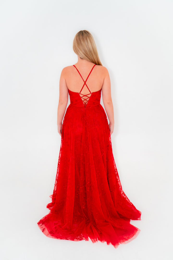 Feminine A-Line floral embroidered tulle gown. Structured wrap style bodice with v-neckline, spaghetti straps, pleated detailing on bodice and in-built bra cups. A crossover strappy back ensures a perfect fit with invisible back zip. Gown is fully lined for comfort.