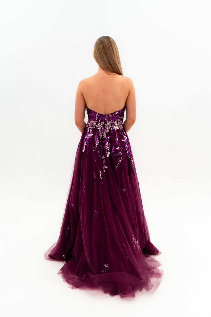 Delicate and striking gown. Strapless sweetheart neckline, embellished bodice with sparkling patterned sequins which continue down onto the full A-line floor length petticoat skirt. Gown is crafted from tulle, has built-in bra cups, fully lined with invisible back zip. Sure to be Belle Of The Ball in this stunning gown.